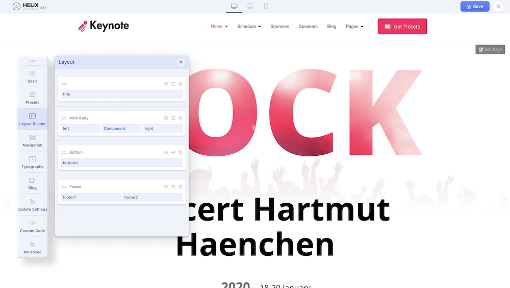 The following screenshot highlights the main layout module positions that we used in the current template. By using Layout Builder in Helix Ultimate, you're able to move positions or even change their sizes in the grid (based on Bootstrap 4). Our in-built layout builder from template settings provides you the opportunity to add new positions, columns, and rows wherever you need and to move the elements as much as you want. You can find more information & tips inside the Helix Ultimate Manual.