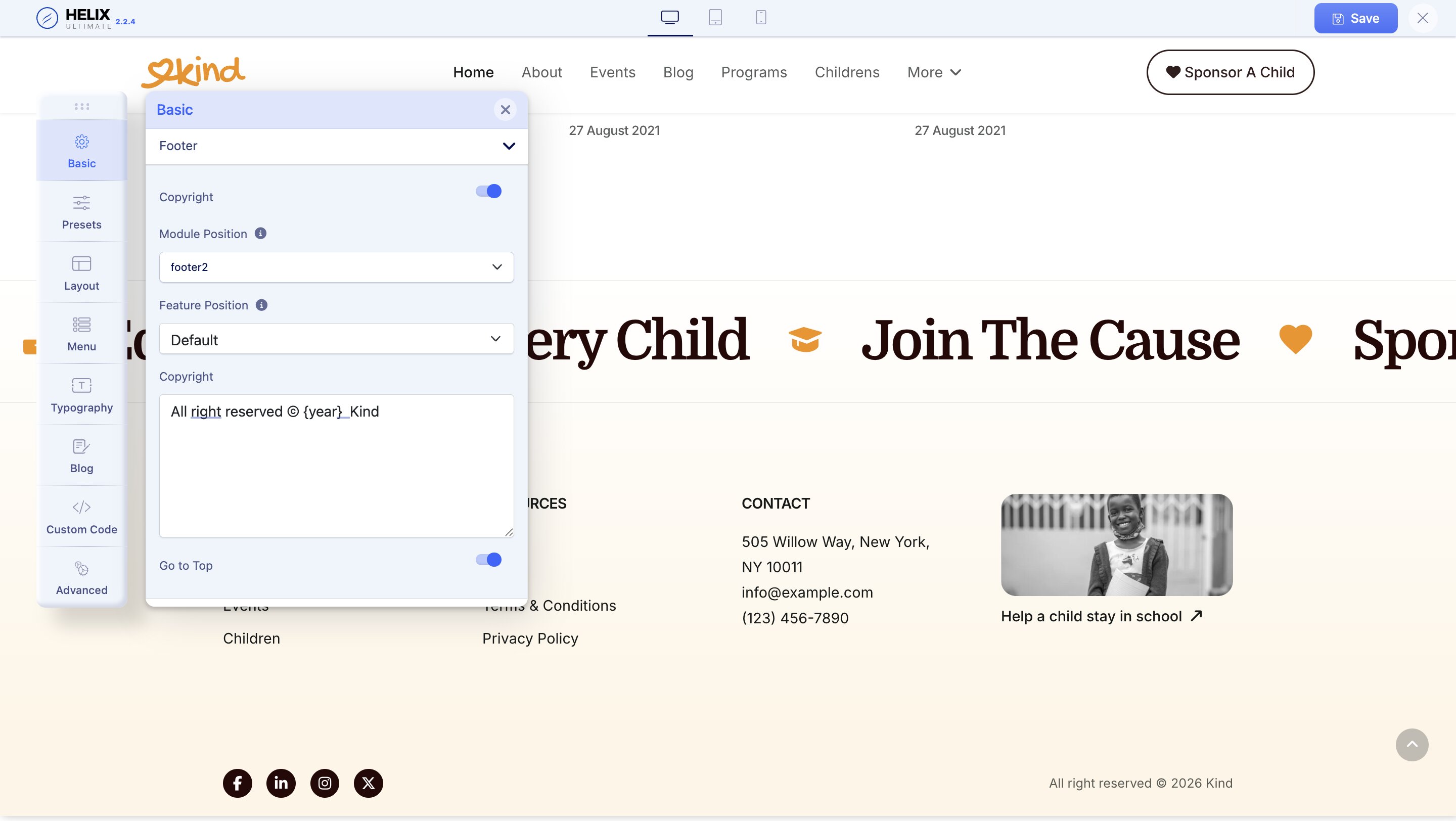 By default, the Kind template's copyright note module position is at the footer1 position. You can also change your Module Position and Feature Position and edit the Copyright Note.