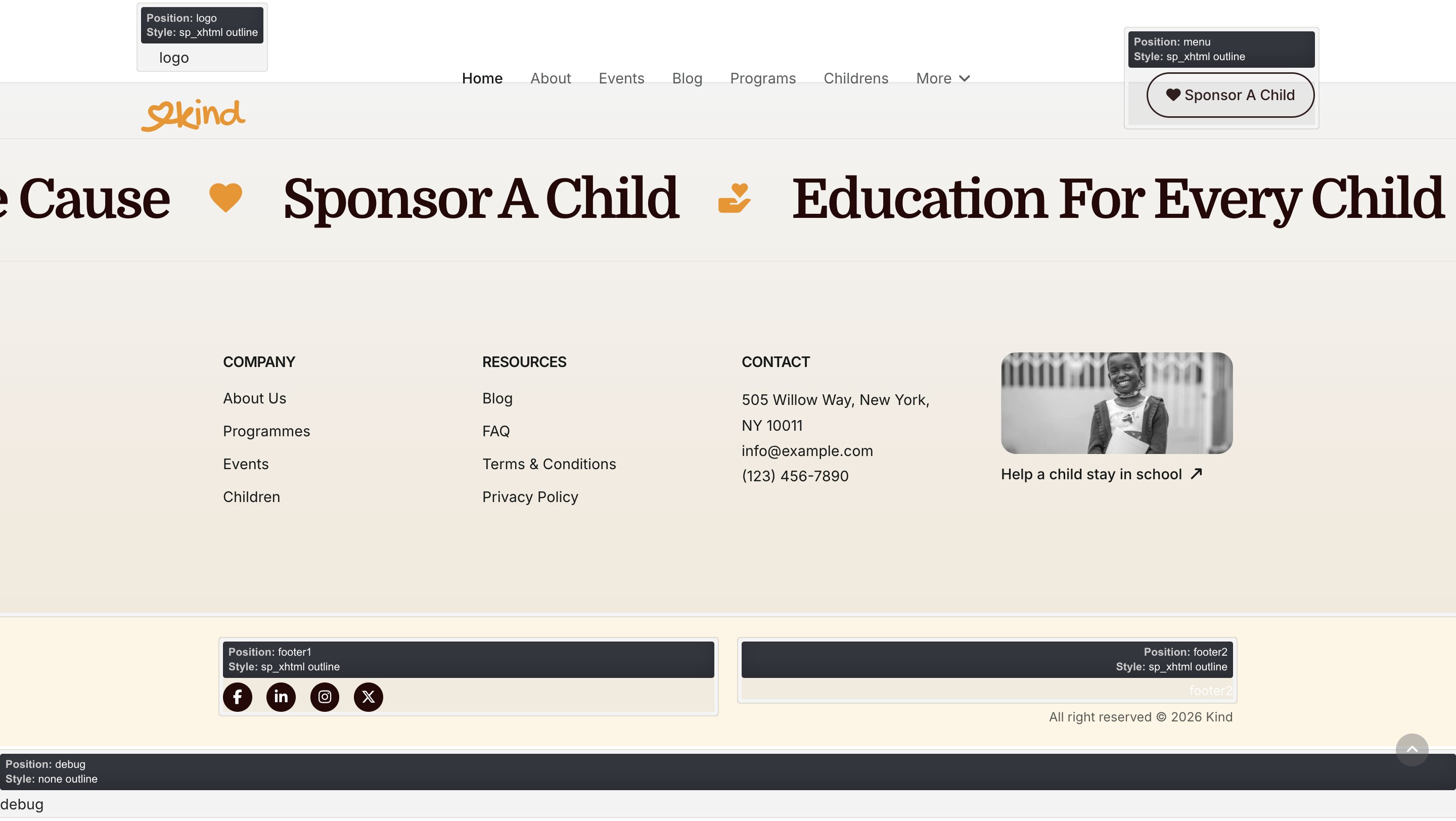 At the bottom of the template (that is footer position), we used one SP Page Builder module (footer1).