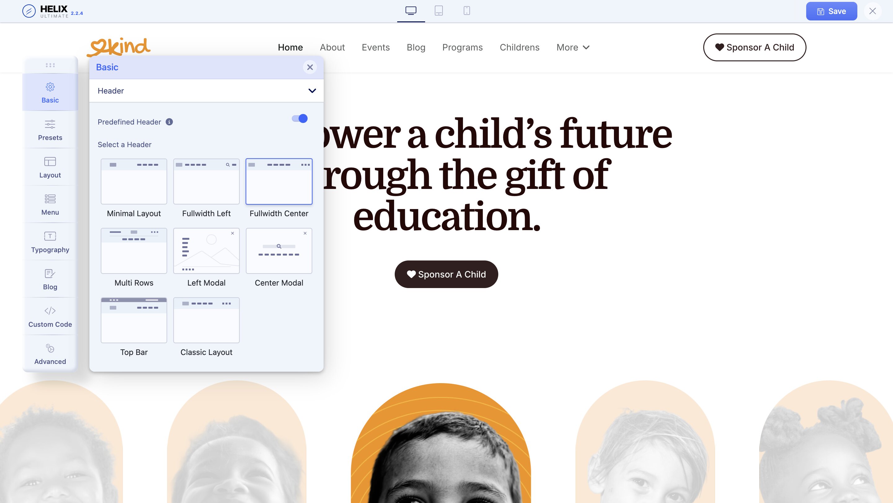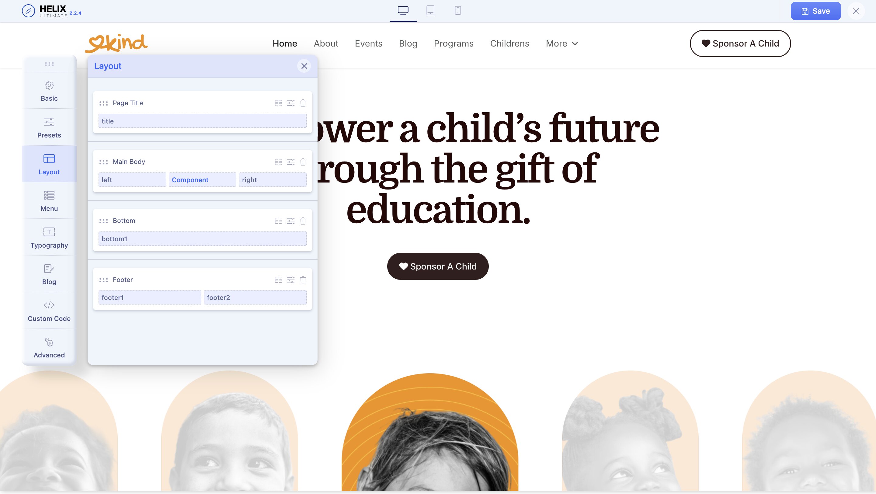 From the Helix Ultimate editor, select the Layout tab from the Sidebar. You will be presented with the option to customize the website layout used in this template.