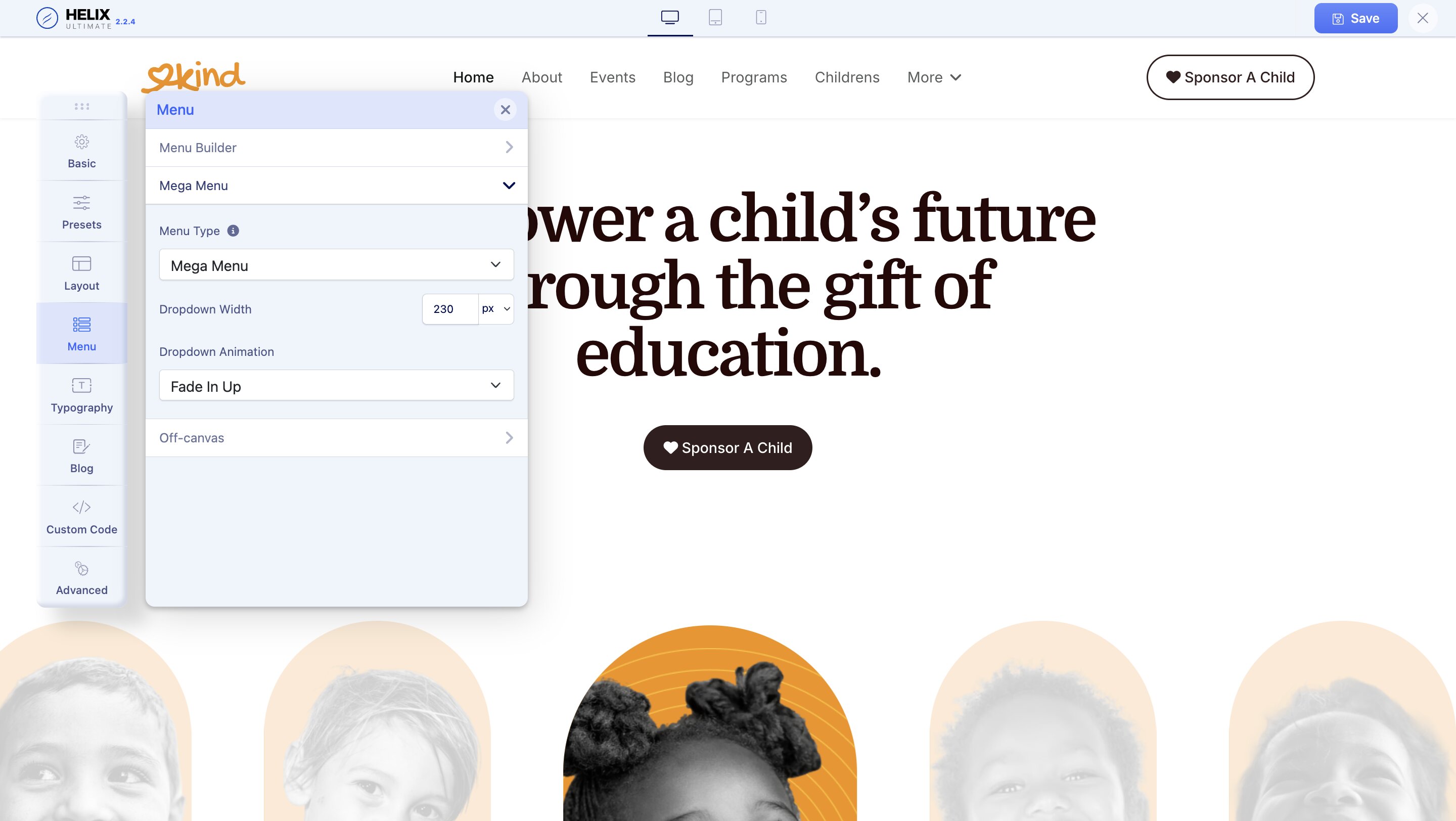 The Kind Joomla template doesn't include a mega menu by default. However, you can easily access the option to enable Mega Menu by hovering over the menu items in the Menu Builder.