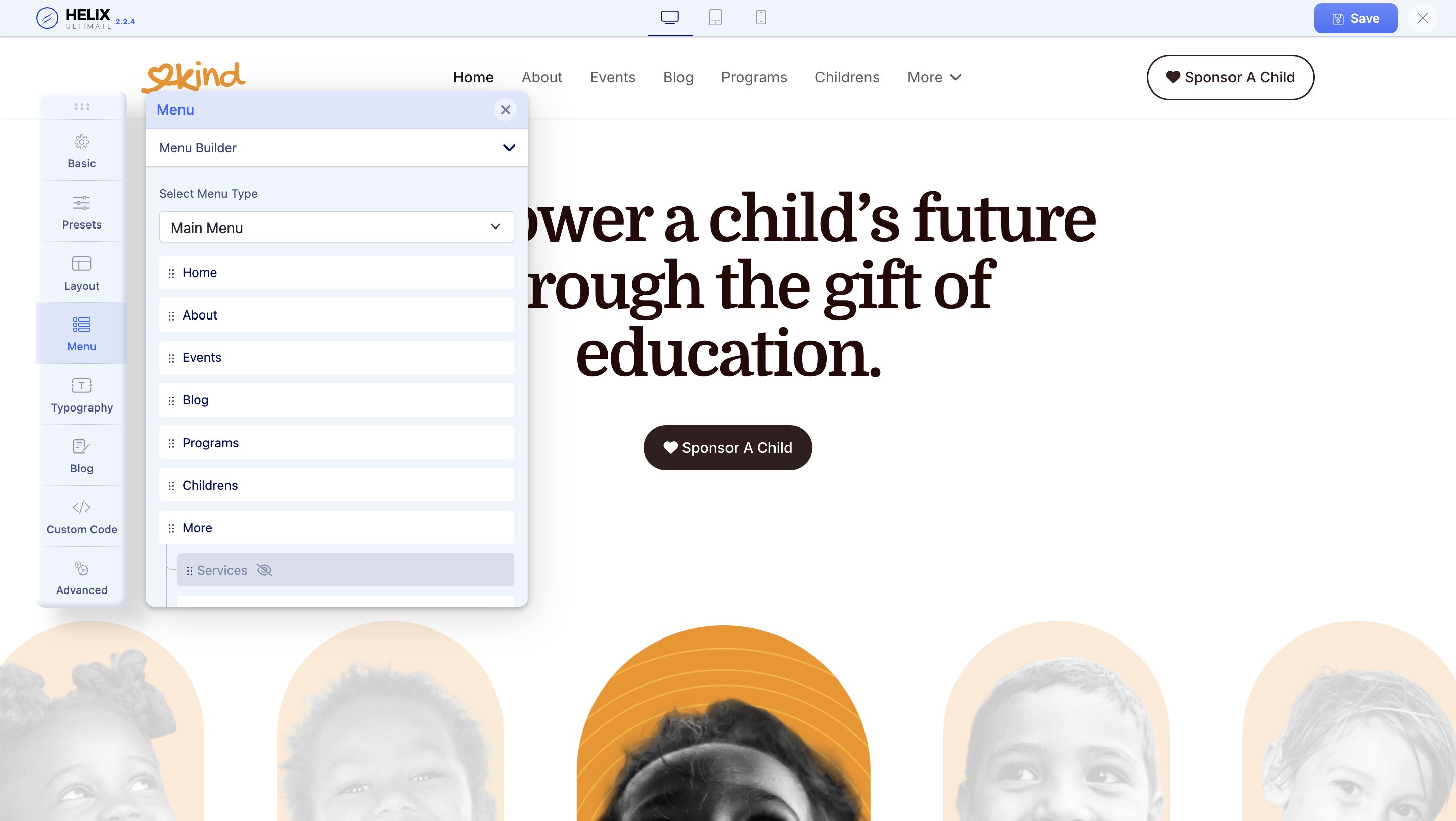 You can add a menu item to the existing menu from the menu builder option. All the menu items you see in the Kind template are listed here, along with the submenus. Upon hovering over each of the items, you can edit, delete, or access the extra settings and Mega Menu option.