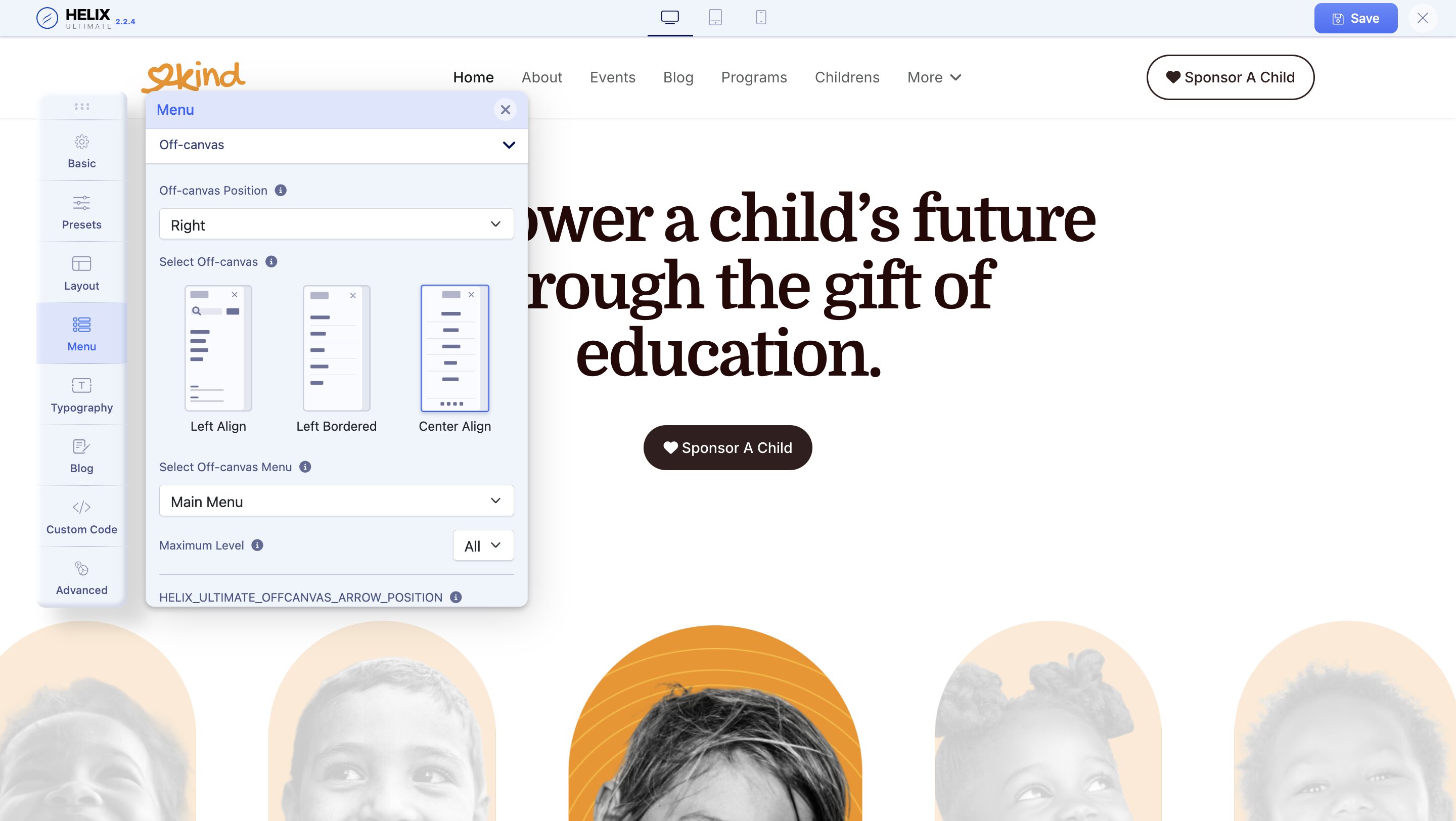 By default, Kind’s off-canvas menu is positioned on the right with a center-aligned alignment. You can easily customize and adjust both the position and alignment using the available options.