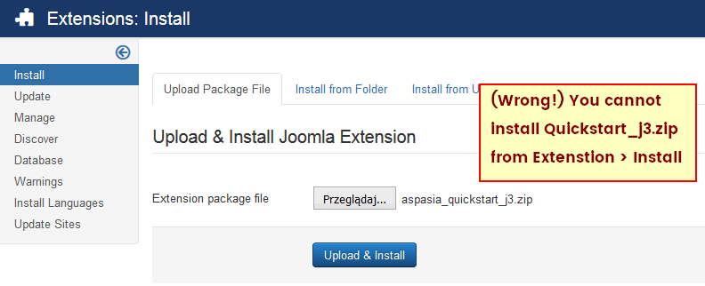 - Unfortunately, it is not possible to install the Quickstart package inside an existing Joomla installation via the Extension Manager.