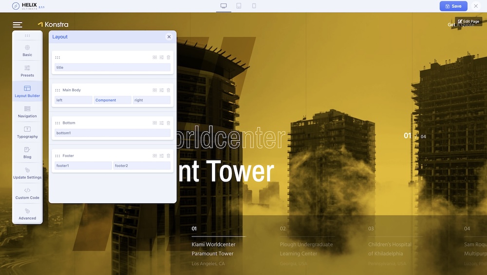Note #2: The Template has additional module positions, although they are not visible in Layout Builder, which can be used to display modules above and below the component area.