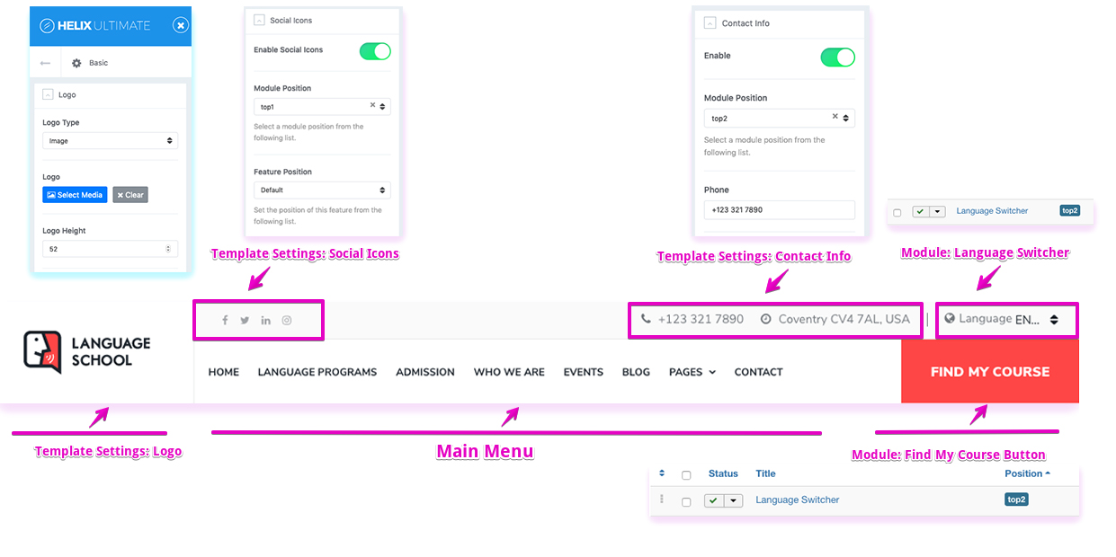 Logo: The logo comes from the Helix Ultimate template settings. To change your logo, navigate to Joomla Dashboard > Extensions > Site Template Styles > shaper_languageschool - Default > Template Options > Basic > Logo.