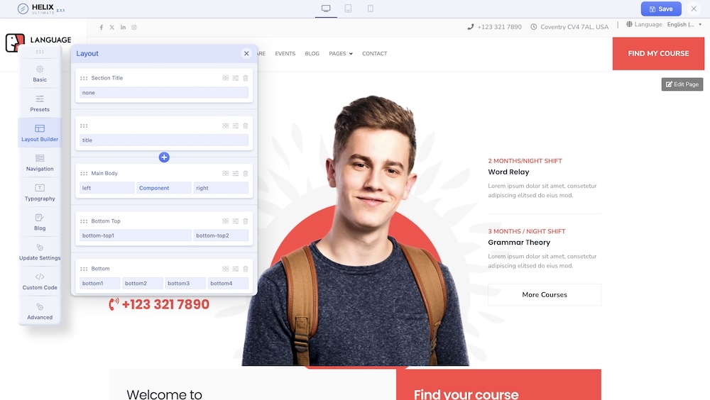 The following screenshot highlights the main layout module positions that we used in the current template. By using Layout Builder in Helix Ultimate, you're able to move positions or even change their sizes in the grid (based on Bootstrap 4). Our in-built layout builder from template settings provides you the opportunity to add new positions, columns, and rows wherever you need and to move the elements as much as you want. You can find more information & tips inside the Helix Ultimate Manual.