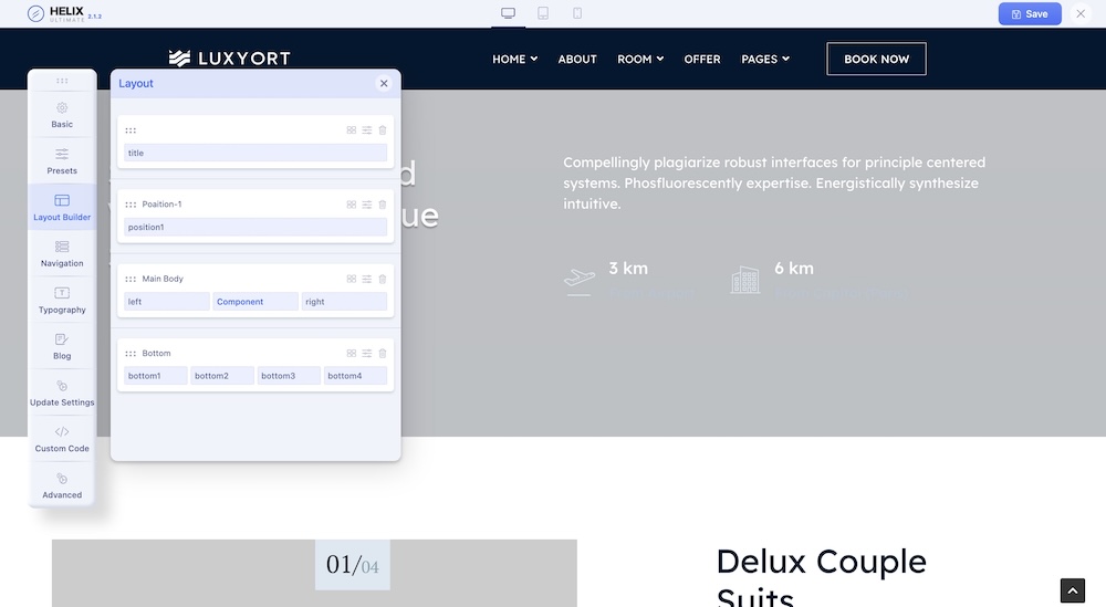 The following screenshot highlights the main layout module positions that we used in the current template. By using Layout Builder in Helix Ultimate, you're able to move positions or even change their sizes in the grid (based on Bootstrap 4). Our in-built layout builder from template settings provides you the opportunity to add new positions, columns, and rows wherever you need and to move the elements as much as you want. Even hide some of them in the tablet or mobile view. More information & tips you will find inside Helix Ultimate Documentation.