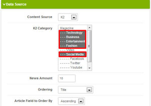 From data source option we selected K2 categories to show headline news by sp news highlighter module. We fixed 10 numbers news by news amount option.