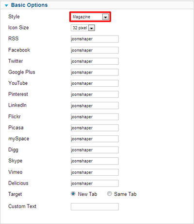In Basic Options we selected the style by Magazine.In this module have 14 social network website link. From basic option put Social Network website user name like facebook (joomshaper), twiter (joomshaper) and others.