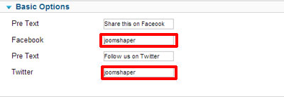 From Basic options we used facebook page id (joomshaper) and Twiter user name (joomshaper) for showing facebook page like and twitter followers
