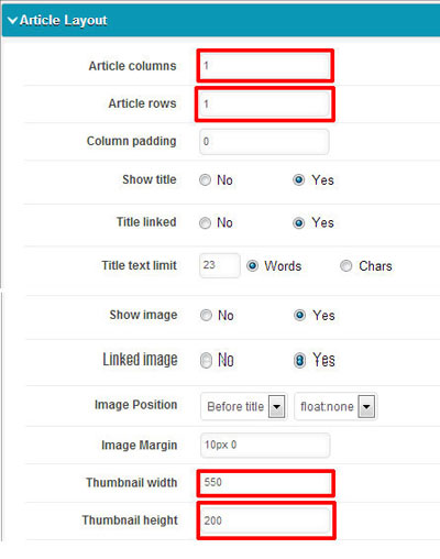 In Article Layout we fixed Article Columns by 1, Article Rows by 1, Thumbnail width by 550 & Thumbnail height by 200.