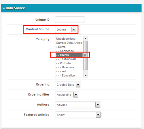 From content source option select joomla.Our Client comes from joomla category name "clients".