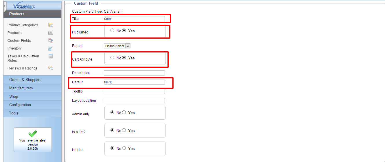After create a new custum field fullfill the necesssary custom field. Here we fiexed the title by color and default by black. We also select yes to the Published and Cart Attribute and select no to the Admin only, Is a list & Hidden.