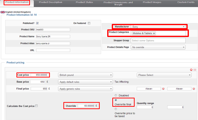 Here we select the product name & information. Here is another options for select the Manufacture, Product categories etc. From product pricing we select he cost price and the Overrride. Then we mark the override final radio button.