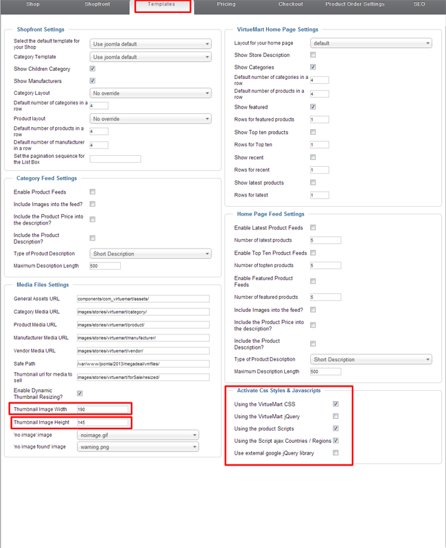 From templates settings we fixed the thumbnail images width and height. Also we are activated the virtuemart css, product scripts and ajax Countries from here.