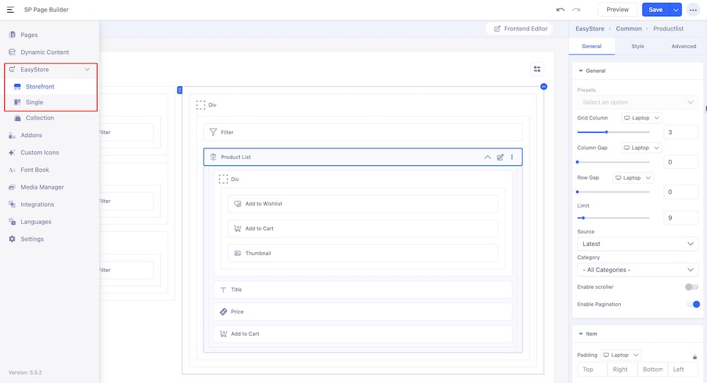 You can also access this template's Storefront and Single Product page from your dashboard’s Component > SP Page Builder Pro > EasyStore. This will take you to the backend editor of the Storefront and you can start editing your Storefront page. Also, to access the Single Product page, choose the Side Topbar (Hamburger Menu) and expand the EasyStore tab. From here you can choose this template's Single Product page and start editing it.