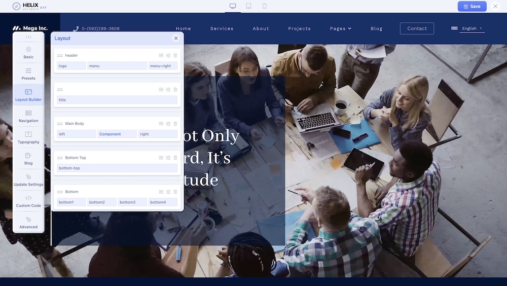 The following screenshot highlights the main layout module positions that we used in the current template. By using Layout Builder in Helix Ultimate, you're able to move positions or even change their sizes in the grid (based on Bootstrap 4). Our in-built layout builder from template settings provides you the opportunity to add new positions, columns, and rows wherever you need and to move the elements as much as you want. You can find more information & tips inside the Helix Ultimate Manual.
