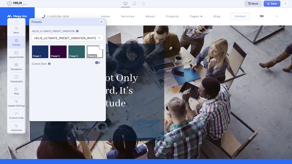 The MegaInc Template also offers four variations of website colors (styles). Go to System > Site Template Styles > Megainc - Default > Template Options > Presets. Then save changes. Keep in mind that the default Home Page (built-in using SPPB) was originally designed for a dark layout, so you have to change some of the other default colors. You can also enable the Custom Style option to enhance and customize the visuals.