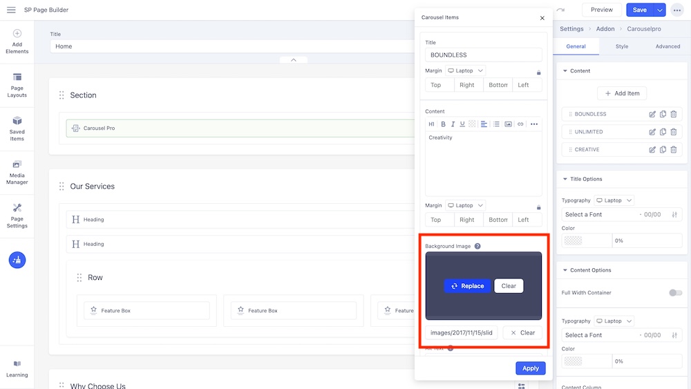 From there, click on any of the items under the Content section, which will provide you with the option to edit the title, content and much more. Here, you will find the Background Image option. Simply replace the image by uploading one via the Media Manager or using a URL.