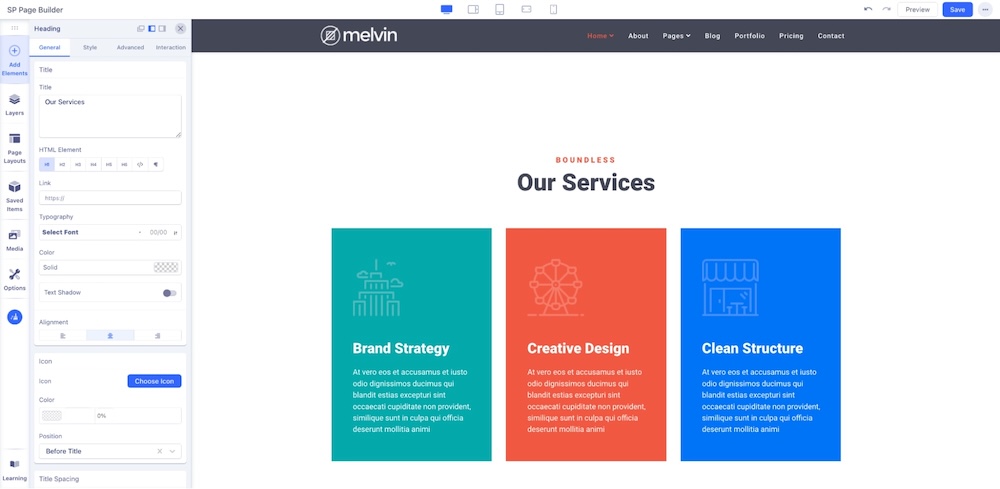 Default homepage and several subpages in the Melvin template demo were created using SP Page Builder Pro components.
