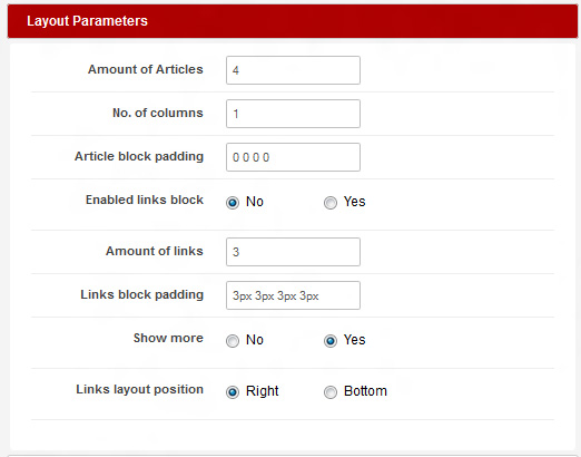 From Layout parameters Ammount of Articles is 4 and No of columns is 1.Link Layout position is "Right".