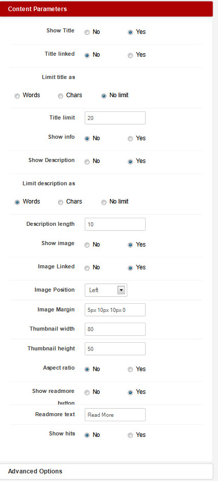 From Content Parameters opttion Show Title option is "Yes".Thumbnail width and height is 80px and 50px.