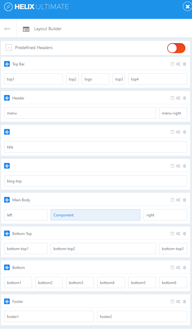 The following screenshot highlights the main layout module positions that we used in the current template. By using Layout Builder in Helix Ultimate, you're able to move positions or even change their sizes in the grid (based on Bootstrap 4). Our in-built layout builder from template settings provides you the opportunity to add new positions, columns, and rows wherever you need and to move the elements as much as you want. More information & tips inside Helix Ultimate Manual.