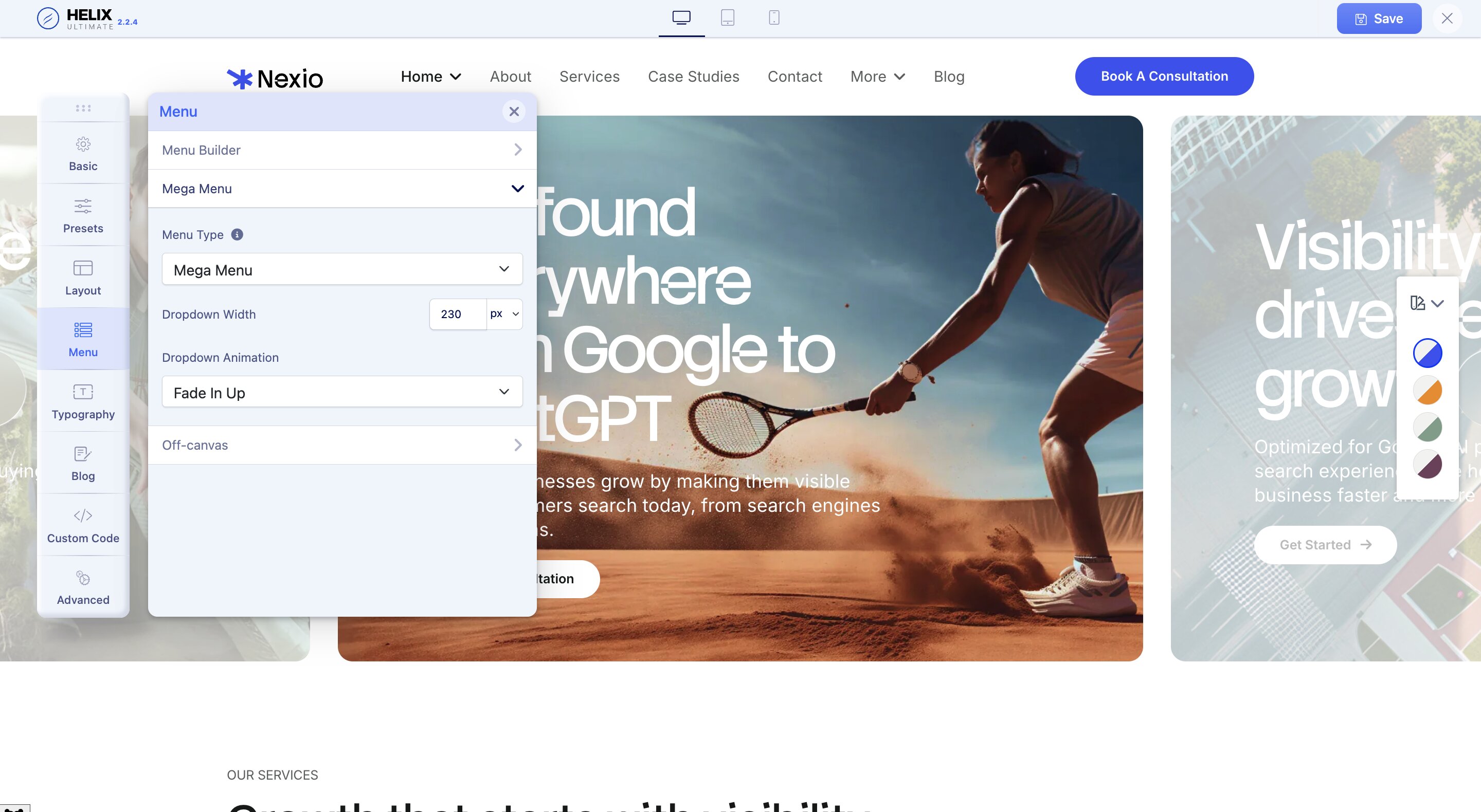 The Nexio Joomla template doesn't include a mega menu by default. However, you can easily access the option to enable Mega Menu by hovering over the menu items in the Menu Builder.