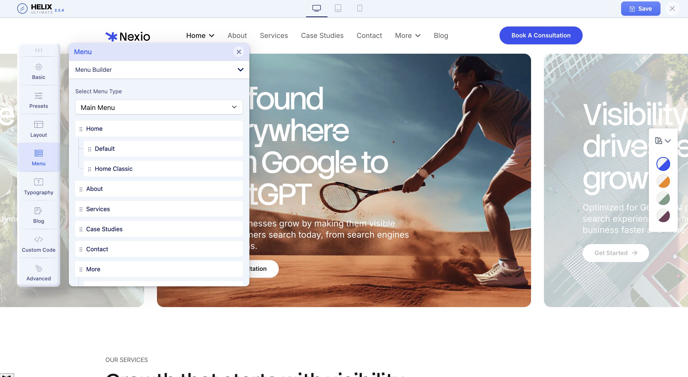 To explore the Nexio template's menu settings through the Helix Ultimate editor, start by accessing your Joomla admin panel.