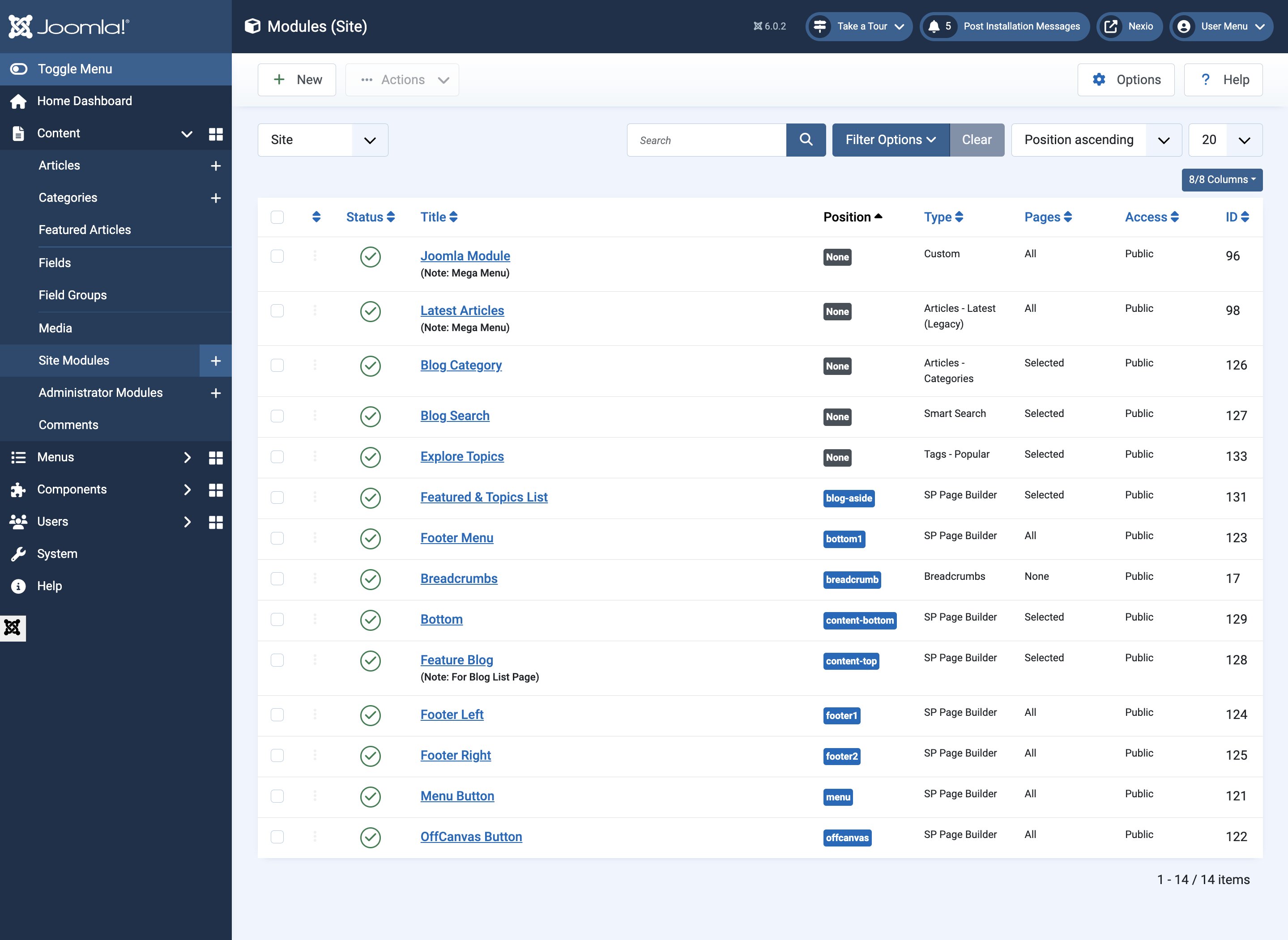 You can easily find the modules in the Justice Joomla template by navigating to the Joomla Admin Panel > Content > Site Modules. From here, you can see the list of published and unpublished modules.