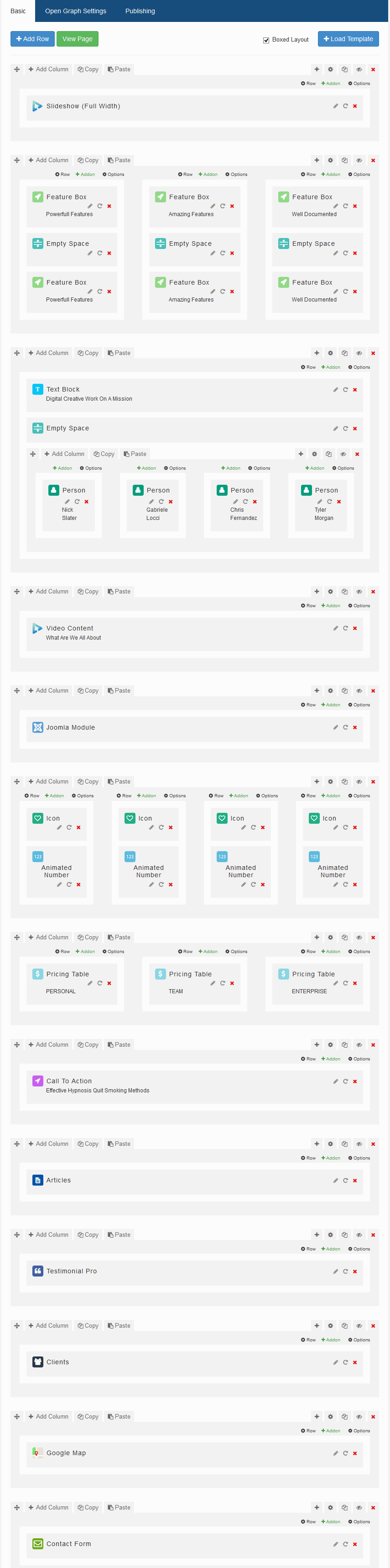 The following screenshot shows the layout of "Home" page (Creative variant) with list of the addons used in the demo content configuration. Whole layout was made using SP Page Builder Pro, included in Quickstart only.