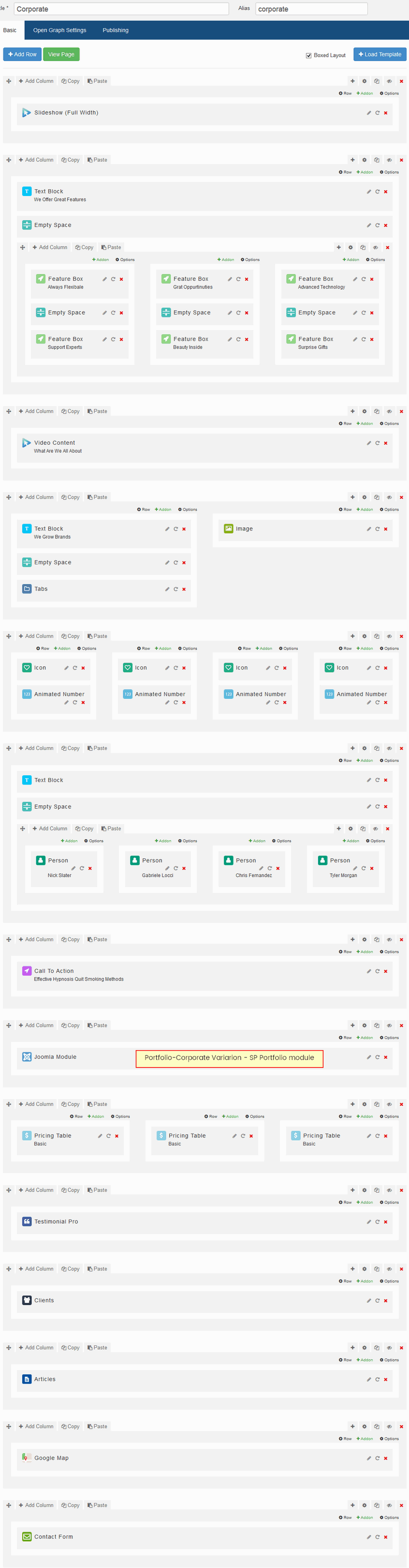 Default homepage like all variants in demo of OneClip template were created using SP Page Builder Pro component. The following screenshot shows the layout of "Home" page (Corporate variant) with list of the addons used in the demo content configuration.