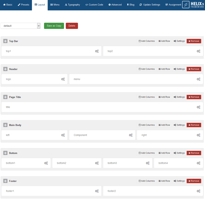 The following screen-shot highlights the default layout module positions that we used in current template. By using Layout builder in Helix3 users will be able to move positions or change their size in the grid. Our in-build layout builder from template settings provide the opportunity to add new positions, columns, rows wherever you need as much as moving elements.