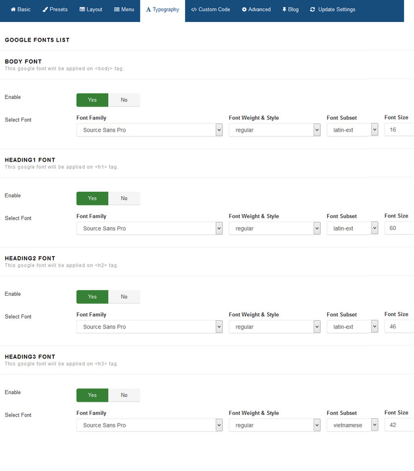 In template demo we used Google Font named: Source Sans Pro for whole demo site typography.