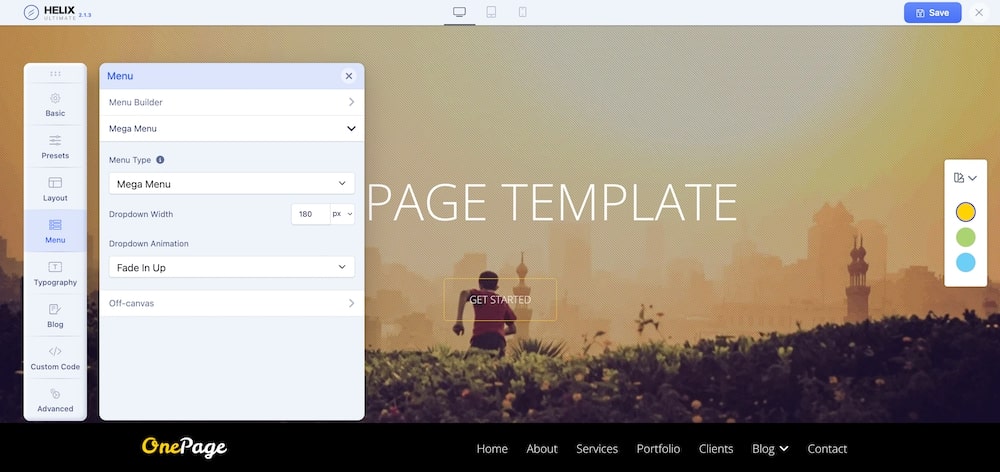 The Onepage Joomla template doesn't include a mega menu by default. However, you can easily access the option to enable Mega Menu by hovering over the menu items in the Menu Builder.