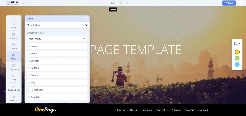 From there, go to System > Templates > Site Template Styles > Select Onepage-Default > Template Options. In the Helix Ultimate’s sidebar, click on the Menu tab, where you'll find three menu configuration options: Menu Builder, Mega Menu, and Off-canvas Menu.