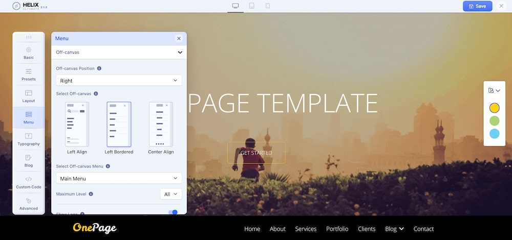 By default, Onepage’s off-canvas menu is positioned on the right with a left alignment. You can easily customize and adjust both the position and alignment using the available options.