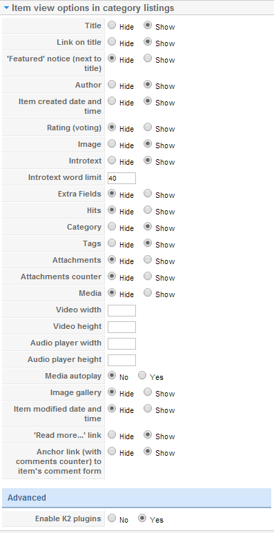 K2 Blog Settings
