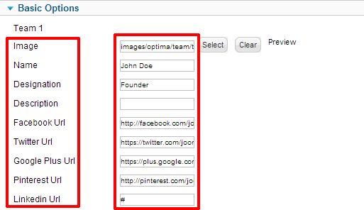 From Basic option we fixed the Image, Name, Designation, Facebook, Twitter, Google Plus, Pinterest url. We do the same to the others, like Team 2, Team 3 & team4. Here is also more option available for select more social url.
