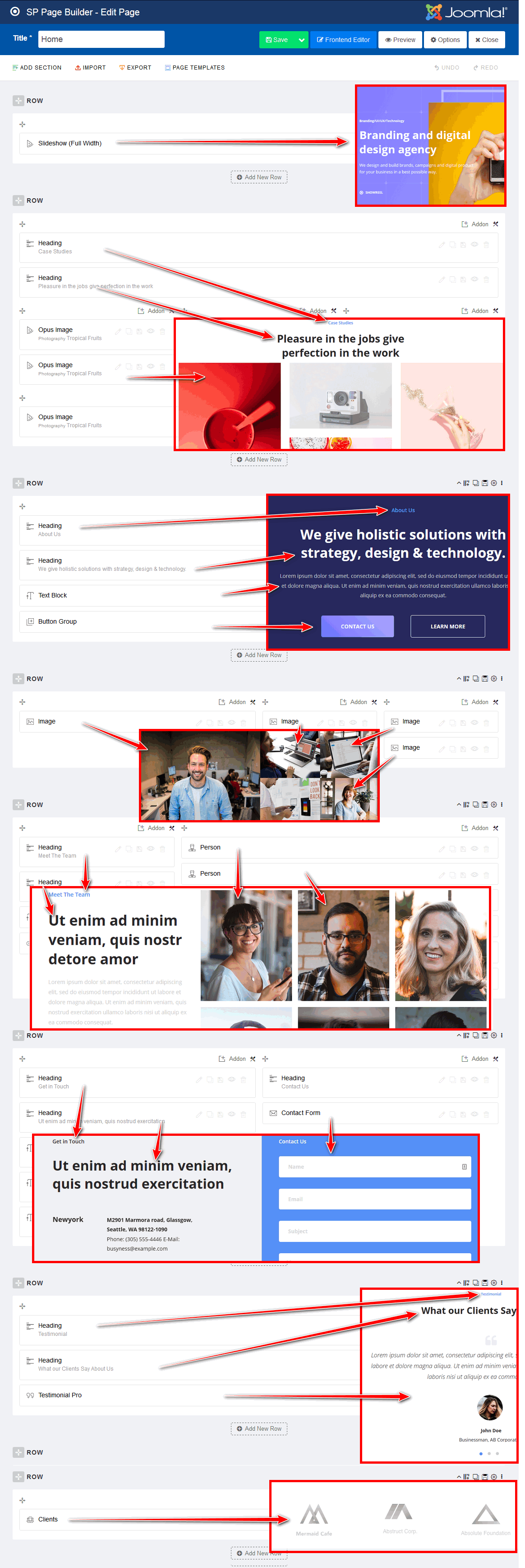The default homepage (and all variants) in the Opus template demo were created using the SP Page Builder Pro component.