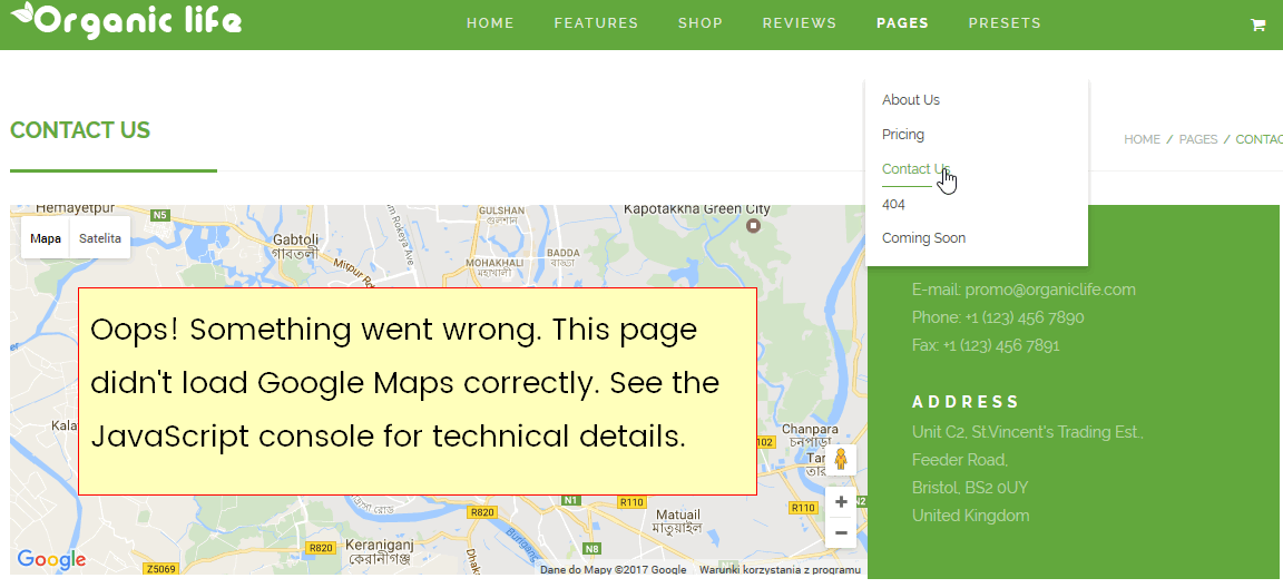 Since 2016 all Google Maps applications require authentication via JavaScript API. To display Google Maps on your website, you need to have Google Maps API key. Otherwise you will see this message.