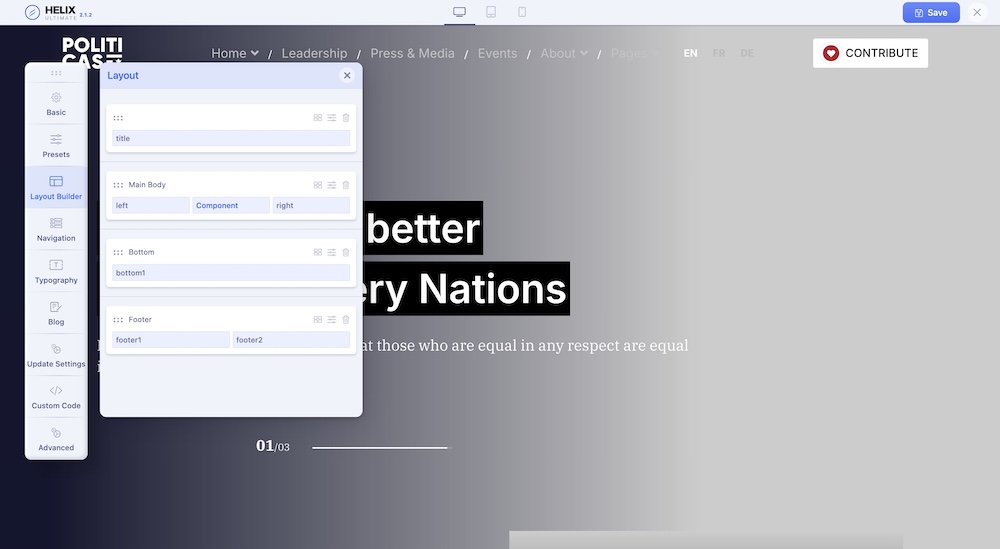 The following screenshot highlights the main layout module positions that we used in the current template. By using Layout Builder in Helix Ultimate, you're able to move positions or even change their sizes in the grid (based on Bootstrap 4). Our in-built layout builder from template settings provides you the opportunity to add new positions, columns, and rows wherever you need and to move the elements as much as you want. Even hide some of them in the tablet or mobile view. More information & tips you will find inside Helix Ultimate Documentation.