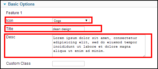 From Basic option we fixed the Icon, Title, description. We do the same to the others like Feature 2 & Feature 3.