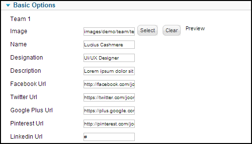 From Basic option we fixed the Image, Name, Designation, Facebook, Twitter, Google Plus, Pinterest url. We do the same to the others, like Team 2, Team 3 & team4. Here is also more option available for select more social url.