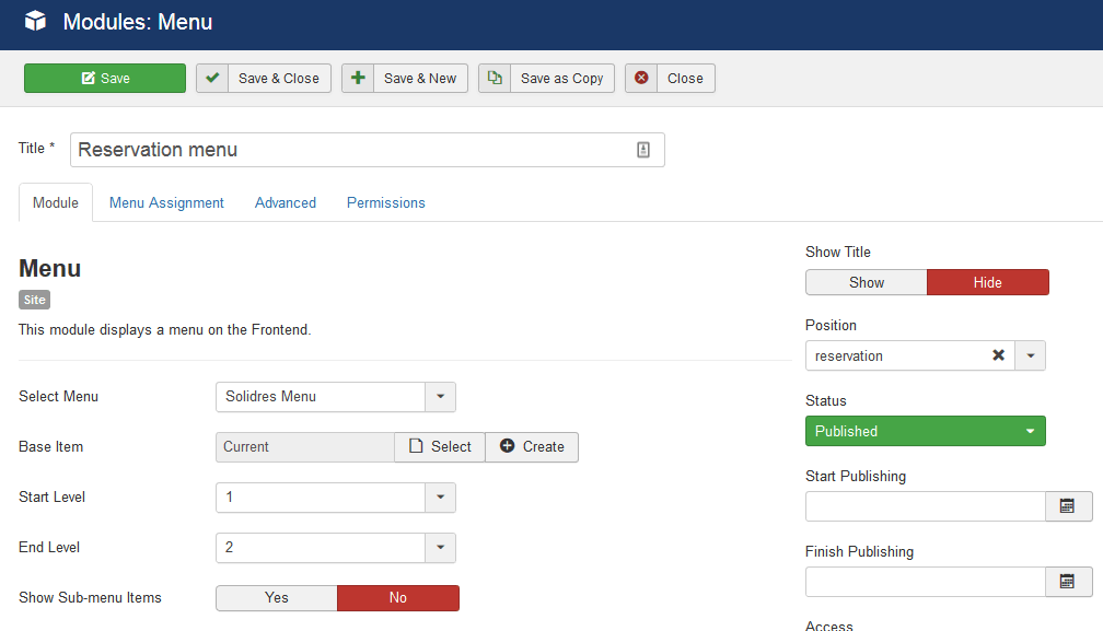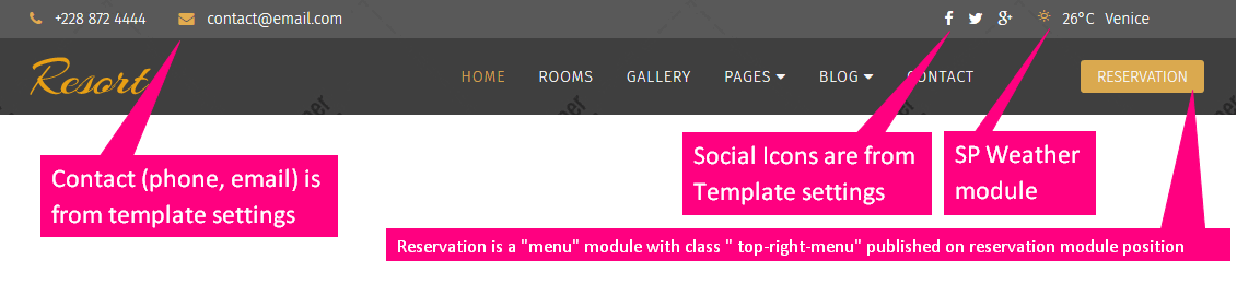 Gold button "Reservation" is a "menu" module, with Menu Class Suffix " top-right-menu"  published on "reservation" module position.