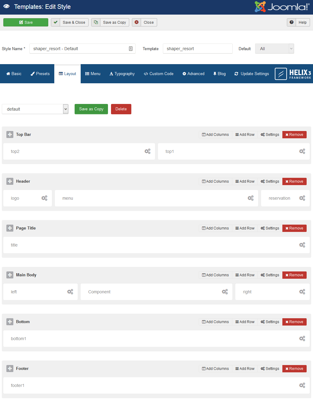 The following screen-shot highlights the default layout positions that we used in Resort template. By using Layout builder in Helix3 users will be able to move positions or change its size. Our in-build layout builder from template settings provide the opportunity to add new positions, columns, rows wherever you need as much as moving elements. Please take a closer look at Header row, where you should have 3 columns: logo, menu and reservation.