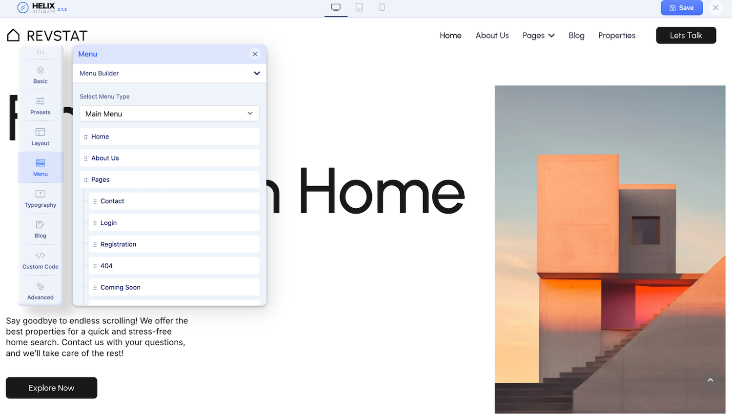 You can add a menu item to the existing menu from the menu builder option. All the menu items you see in the Revstat template are listed here along with the sub menus. Upon hovering on each of the items you can edit, delete, or access the extra settings and Mega Menu option.
