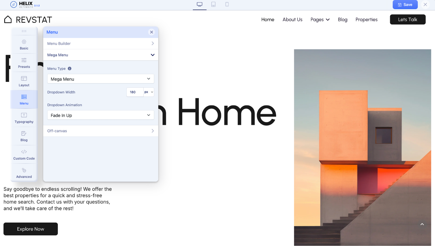 From there, go to System > Templates > Site Template Styles > Select Revstat-Default > Template Options. In the Helix Ultimate’s sidebar, click on the Menu tab, where you'll find three menu configuration options: Menu Builder, Mega Menu, and Off-canvas Menu.