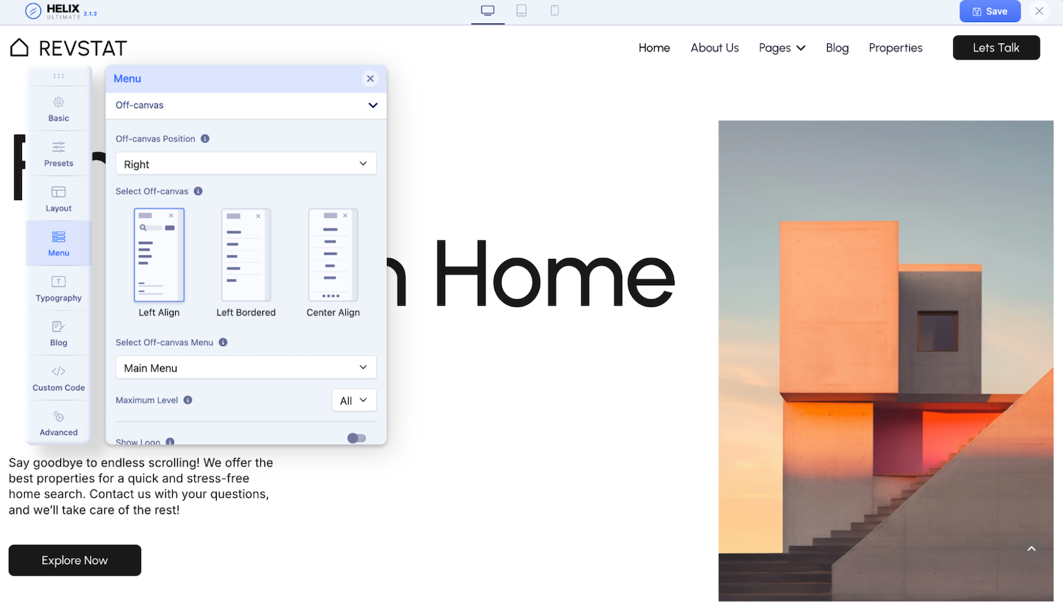 By default, Revstat’s off-canvas menu is positioned on the right with a left alignment. You can easily customize and adjust both the position and alignment using the available options.